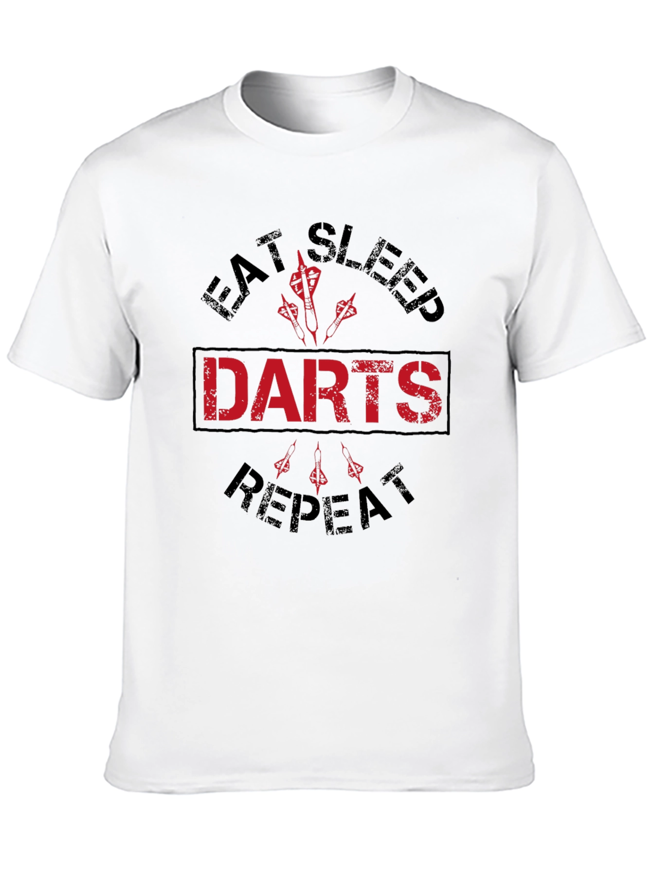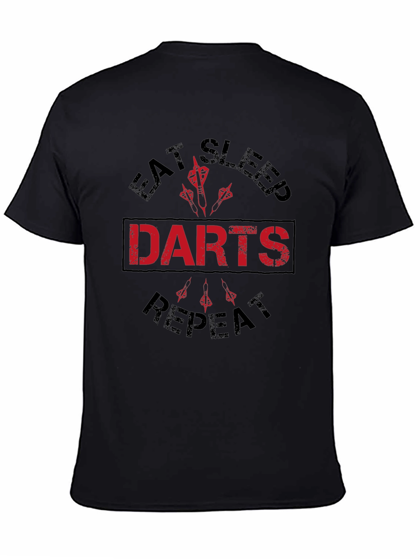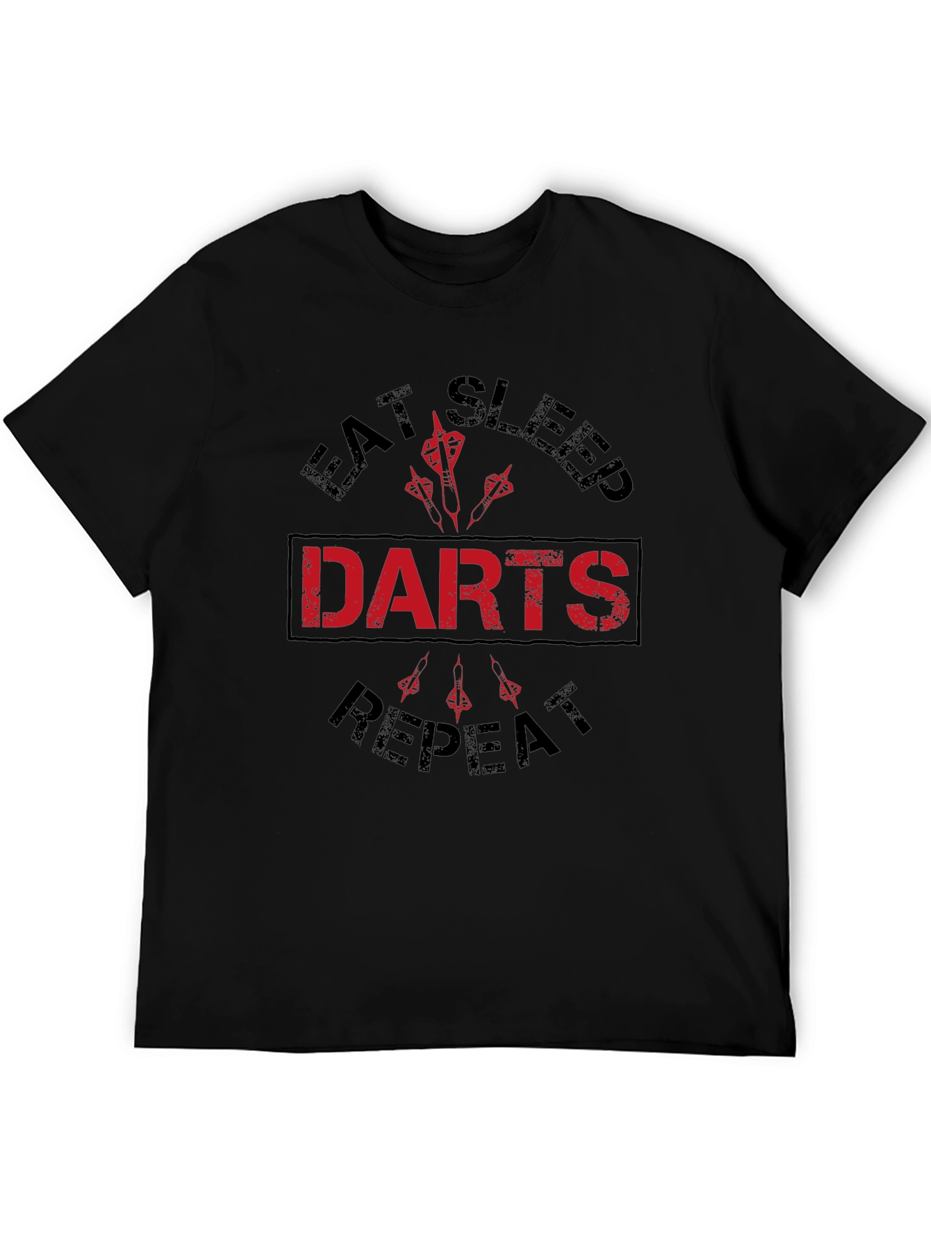 Show off your love for darts with this stylish black graphic tee. The shirt features a bold "Eat Sleep Darts Repeat" design with dart graphics. Made from a comfortable cotton blend, it's perfect for casual wear or your next darts tournament. The distressed design adds a touch of vintage flair. This tee is an excellent way to showcase your favorite hobby.