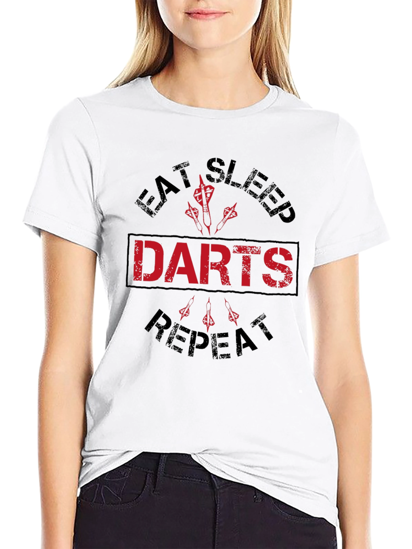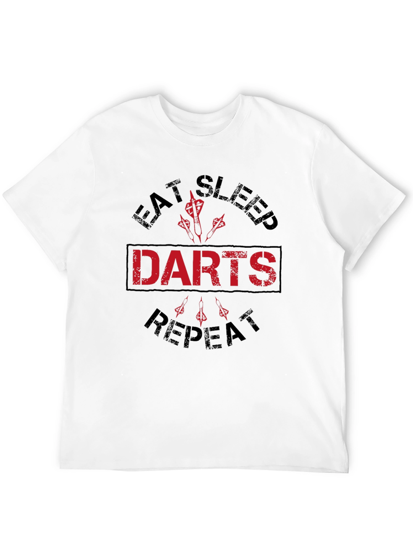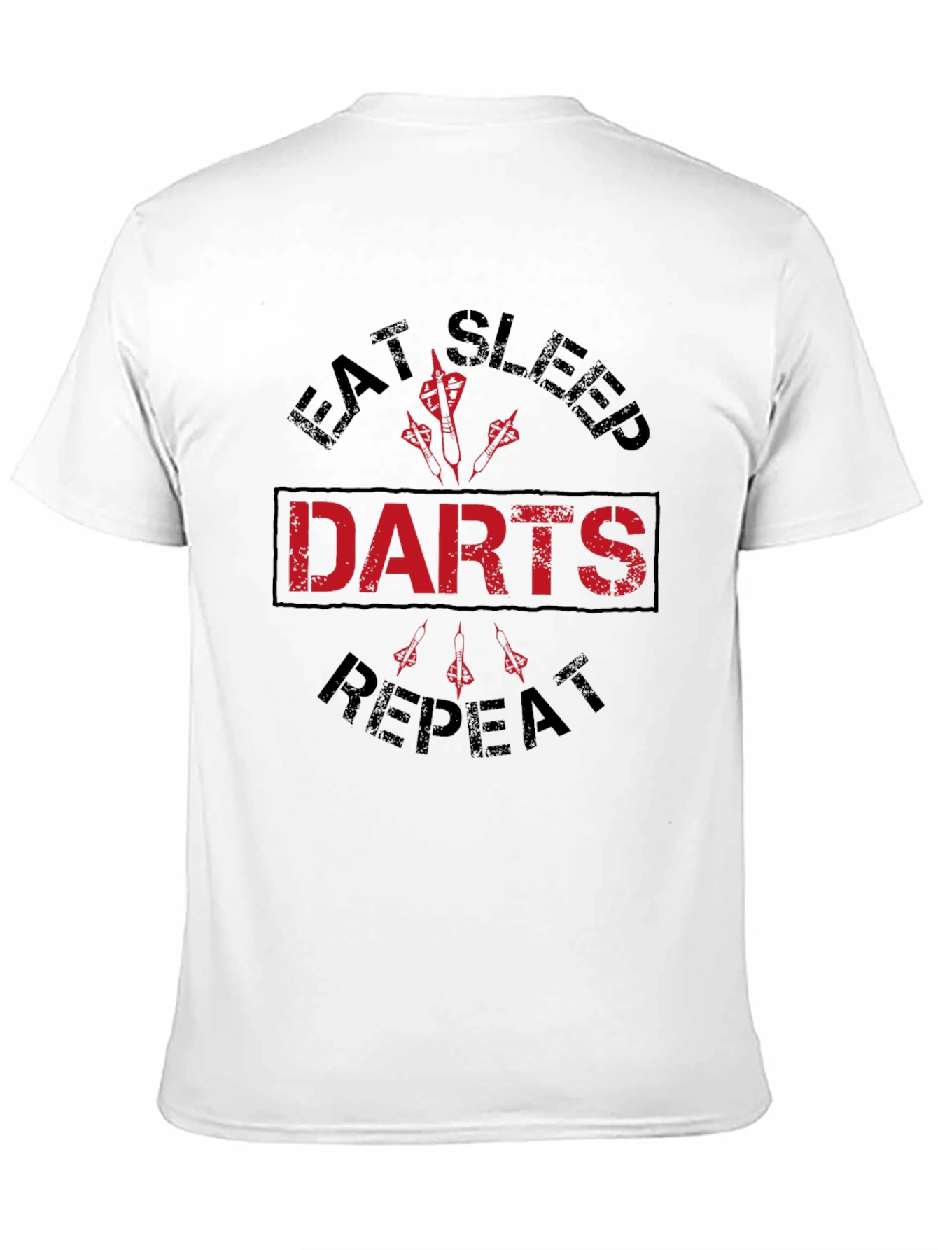 Show off your love for darts with this stylish black graphic tee. The shirt features a bold "Eat Sleep Darts Repeat" design with dart graphics. Made from a comfortable cotton blend, it's perfect for casual wear or your next darts tournament. The distressed design adds a touch of vintage flair. This tee is an excellent way to showcase your favorite hobby.