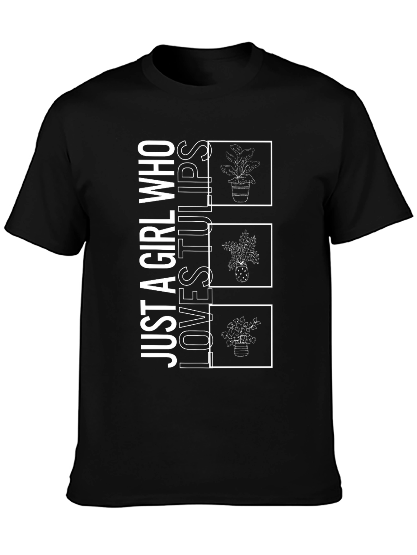 Show your love for tulips with this stylish black graphic t-shirt. Featuring a unique design with tulip illustrations and the phrase "Just A Girl Who Loves Tulips", this shirt is perfect for any flower enthusiast. The design is printed on a soft, comfortable fabric, making it ideal for everyday wear. Whether you're gardening, running errands, or simply relaxing at home, this t-shirt is a great way to express your passion for tulips. This tee is a must-have for any tulip-loving girl's wardrobe and makes a thoughtful gift for birthdays or special occasions.
