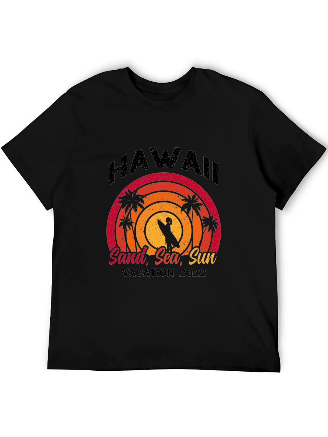 Embrace the Aloha spirit with this stylish black t-shirt featuring a vibrant sunset-themed graphic. The design showcases a silhouette of a surfer with palm trees. The words "Hawaii", "Sand, Sea, Sun," and "Vacation 2022" are printed on the shirt. Perfect for vacationers or anyone who loves Hawaii, this comfortable tee is ideal for casual wear, beach outings, or as a souvenir of your island adventure. Make a statement with this eye-catching design and relive your favorite Hawaiian moments every time you wear it!