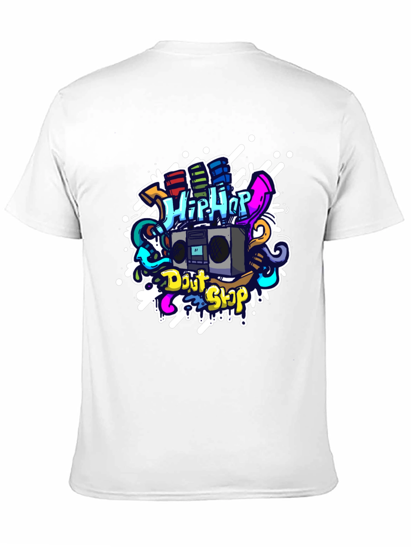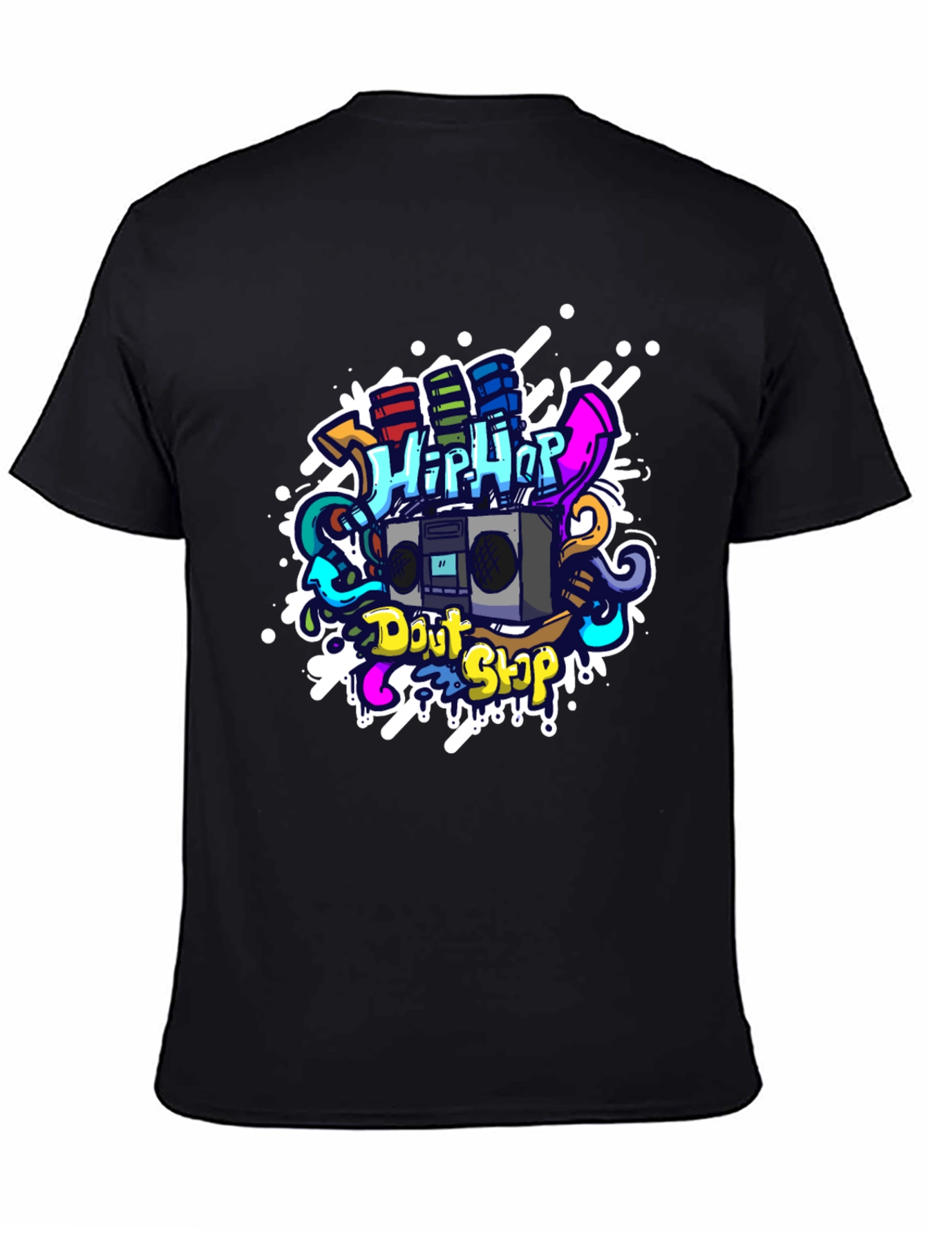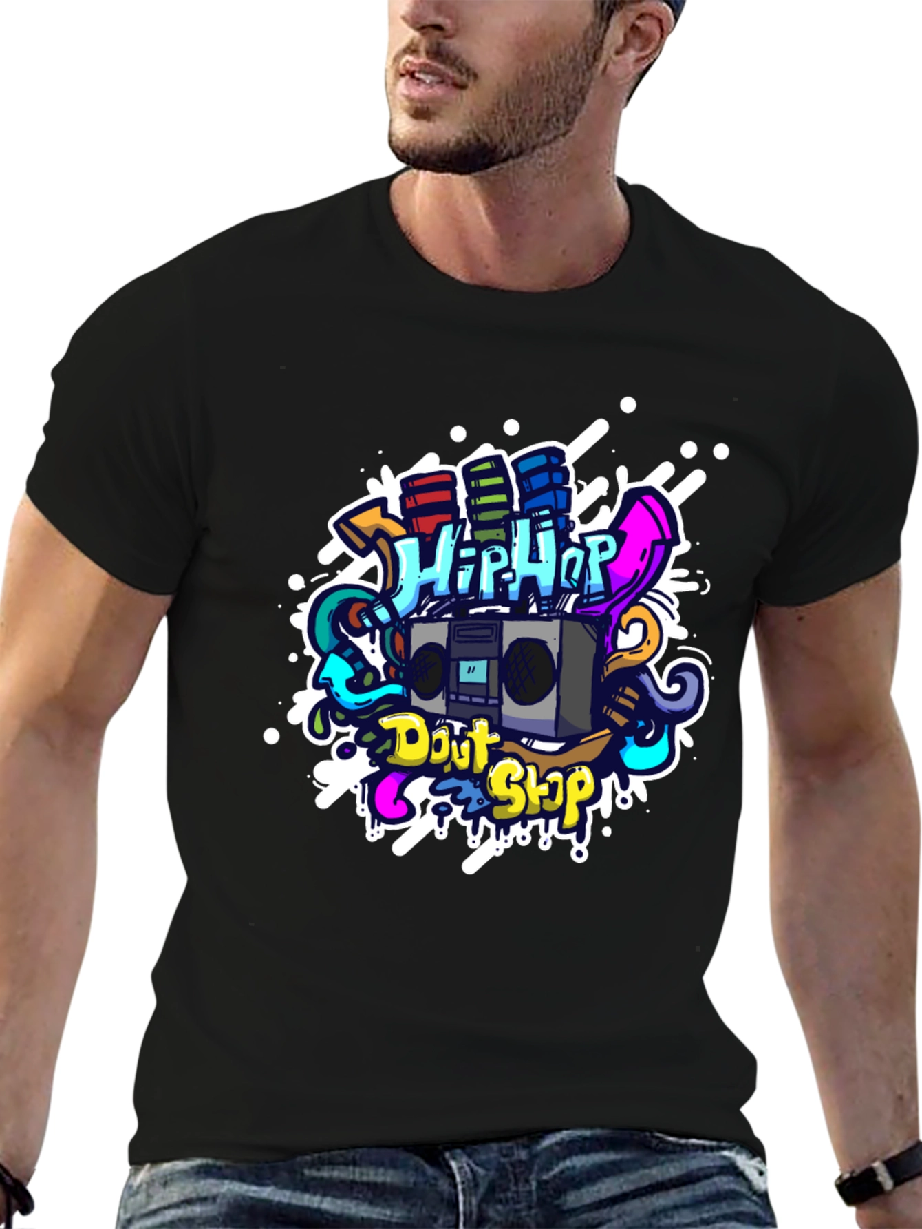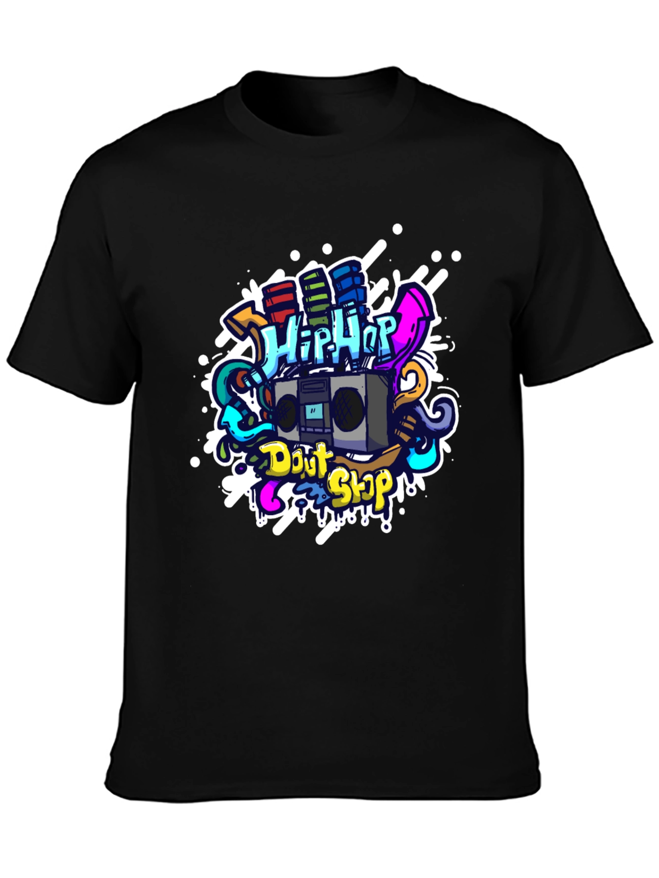 Showcase your urban style with this vibrant black t-shirt. Featuring a bold graffiti-style graphic with "Hip Hop Don't Stop" slogan, complete with a boombox design. The colorful artwork pops against the classic black background. Ideal for casual wear, concerts, or making a statement. A must-have for hip hop enthusiasts and street style aficionados. Comfortable and eye-catching, this tee is bound to become a favorite in your wardrobe. Get yours today and let your style speak volumes!
