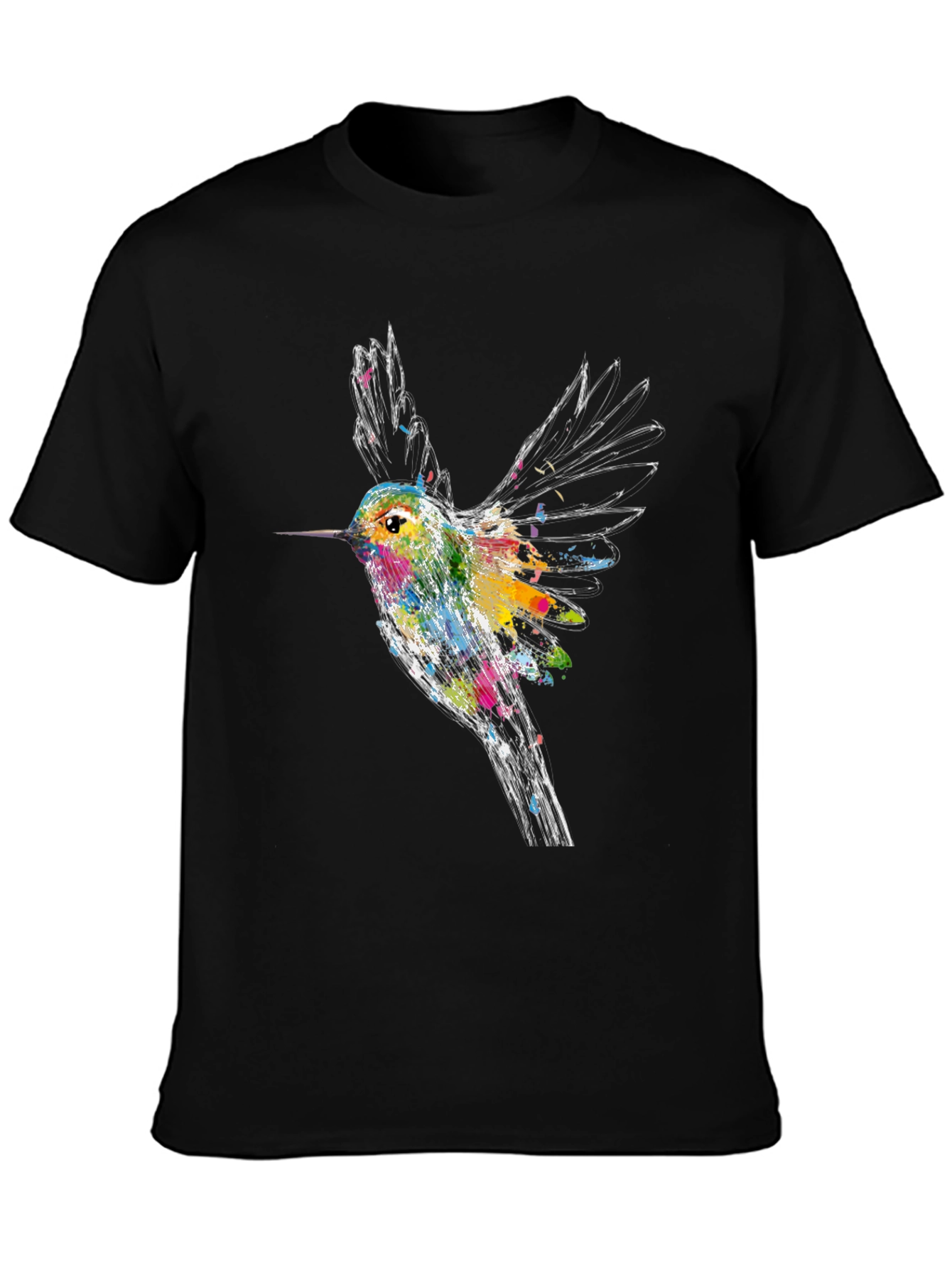 Show off your love for nature with this eye-catching graphic tee. This black t-shirt features a vibrant hummingbird design, seemingly painted with bold strokes of color. The artistic rendering gives it a unique, modern feel. It's made from a soft, comfortable fabric perfect for everyday wear. Pair it with jeans for a casual look, or dress it up with a blazer for a touch of creative flair. A fantastic conversation starter and an excellent gift for bird enthusiasts or anyone who appreciates artful apparel. This shirt is sure to be a standout piece in your wardrobe.