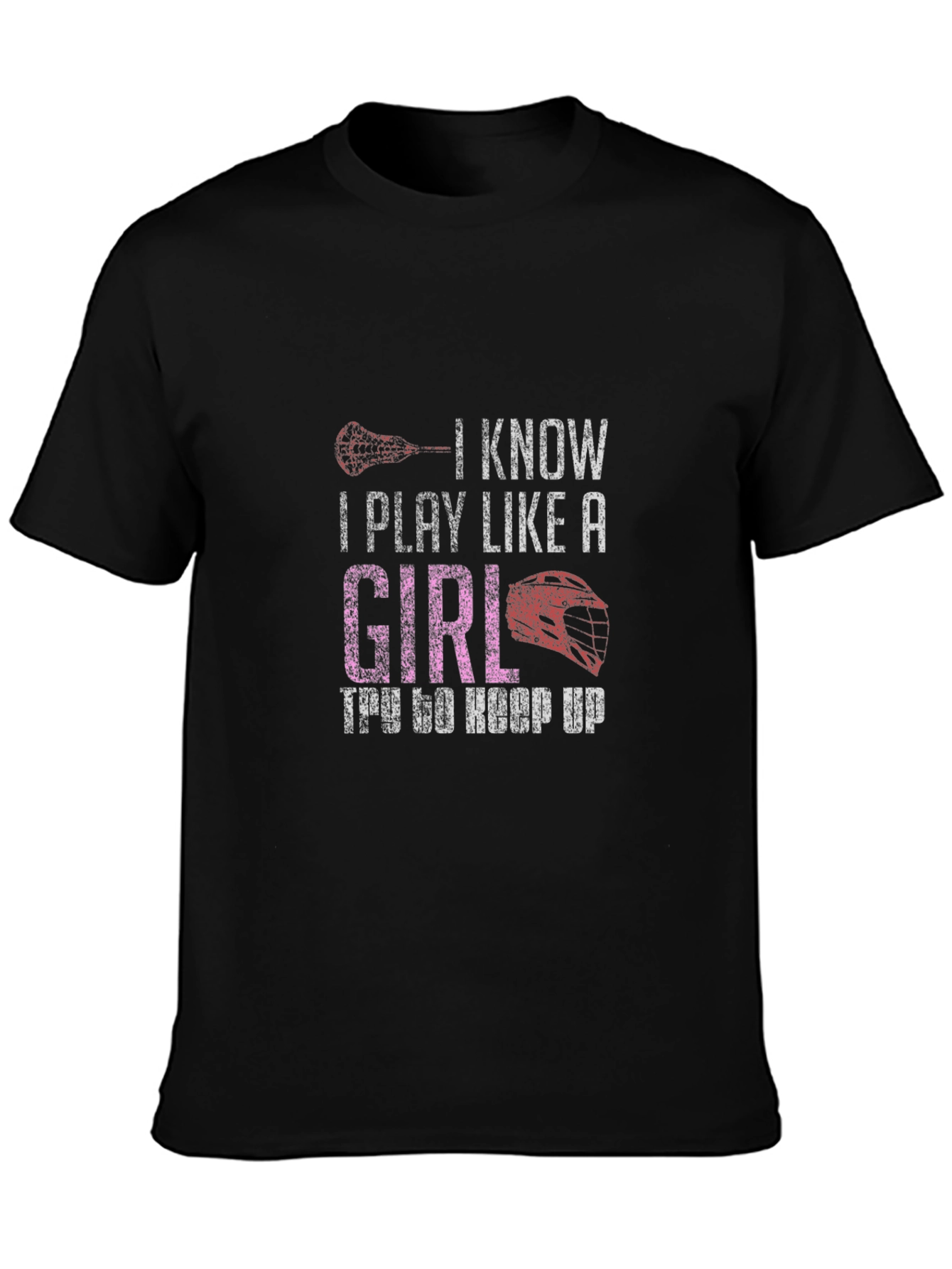 Show your love for lacrosse with this unique t-shirt. The bold graphic features a lacrosse stick, helmet, and the humorous saying "I Know I Play Like A Girl, Try To Keep Up". This shirt is made from comfortable, breathable fabric. The print has a distressed look, adding to its cool vintage vibe. It's perfect for wearing to lacrosse games, practices, or just hanging out with friends. It's a great gift for any lacrosse player who is proud to dominate on the field.