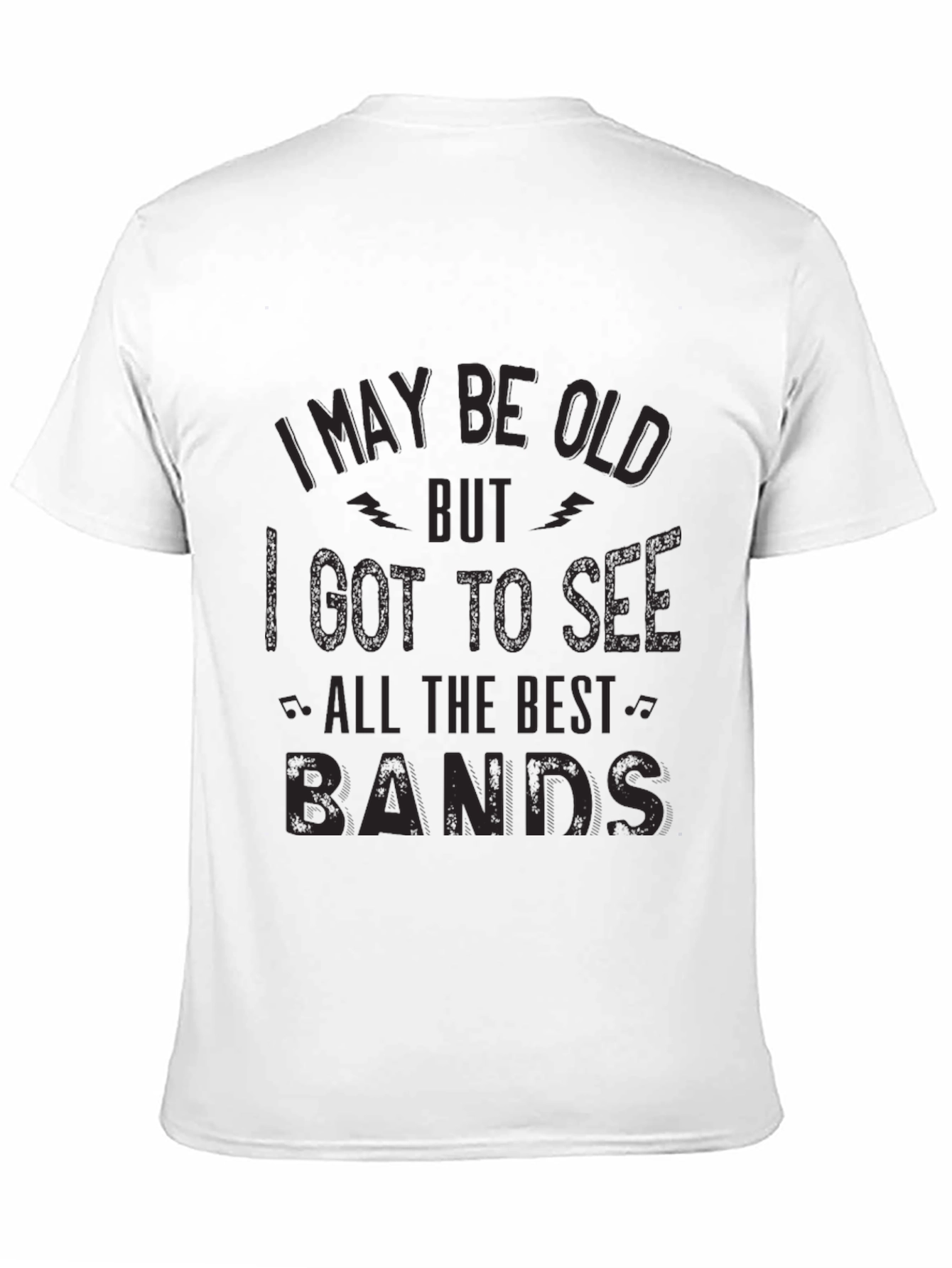 Show off your vintage music pride with this classic black t-shirt. Featuring a bold graphic print "I MAY BE OLD BUT I GOT TO SEE ALL THE BEST BANDS," this tee is perfect for music lovers with a sense of humor. The shirt has a regular fit and is made from a comfortable-looking material, ideal for everyday wear. Wear it to concerts, casual outings, or simply to make a statement. It's a fun way to celebrate your experiences and make a bold statement about your life in music.