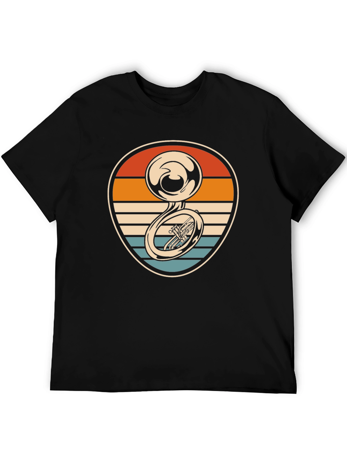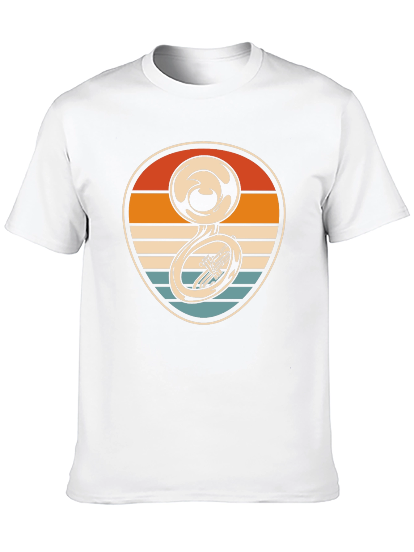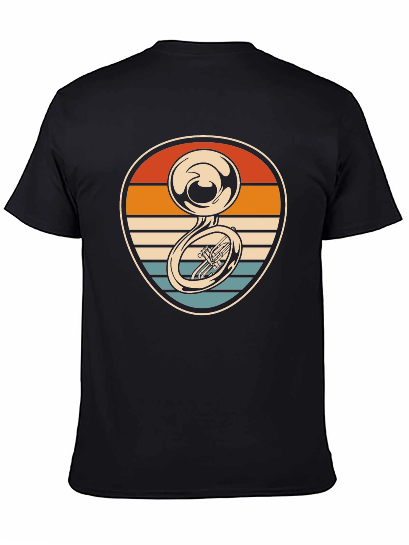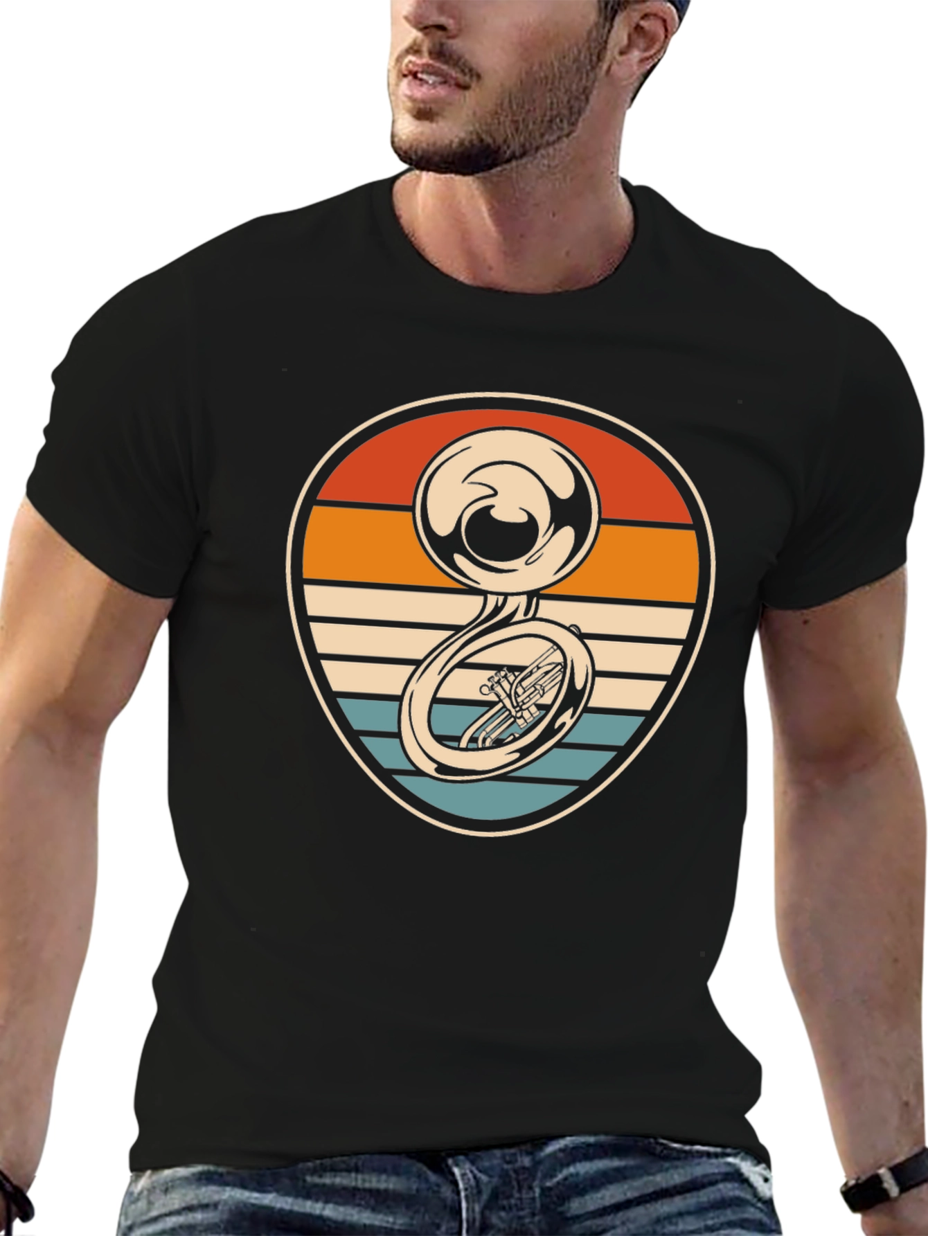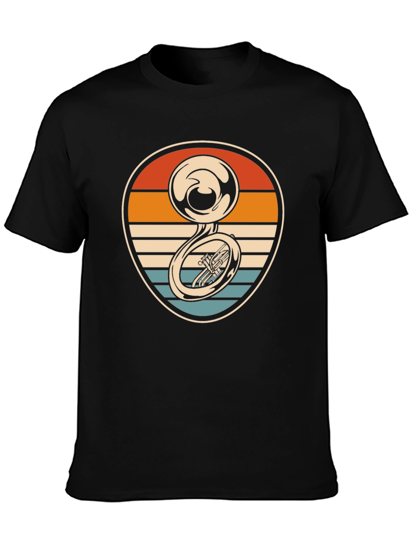 Show off your love for music with this unique T-shirt. This black tee features a retro-style graphic of a tuba set against a vibrant sunset background. The design incorporates warm shades of orange and yellow, contrasted with cool blues and off-white, creating an eye-catching vintage aesthetic. Perfect for musicians, music lovers, or anyone who appreciates a cool graphic tee. Made from comfortable, breathable material, this shirt is ideal for everyday wear. Add some musical flair to your wardrobe today!
