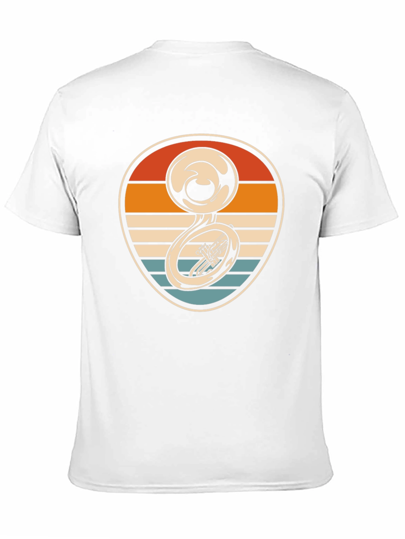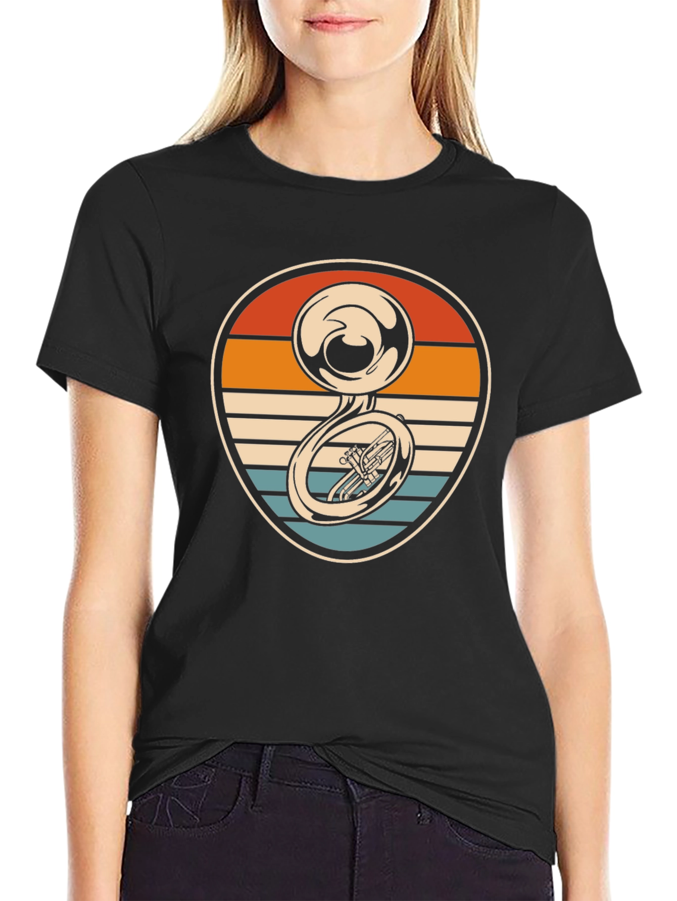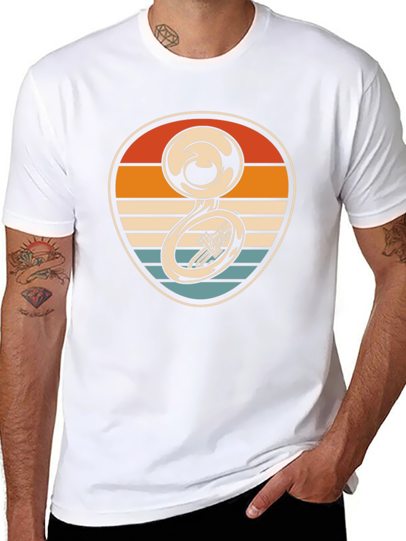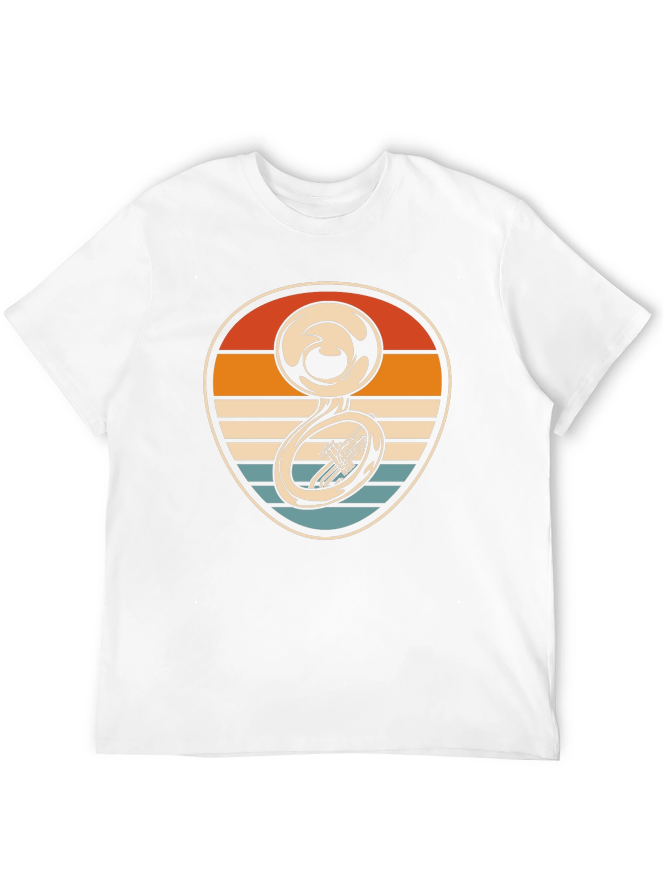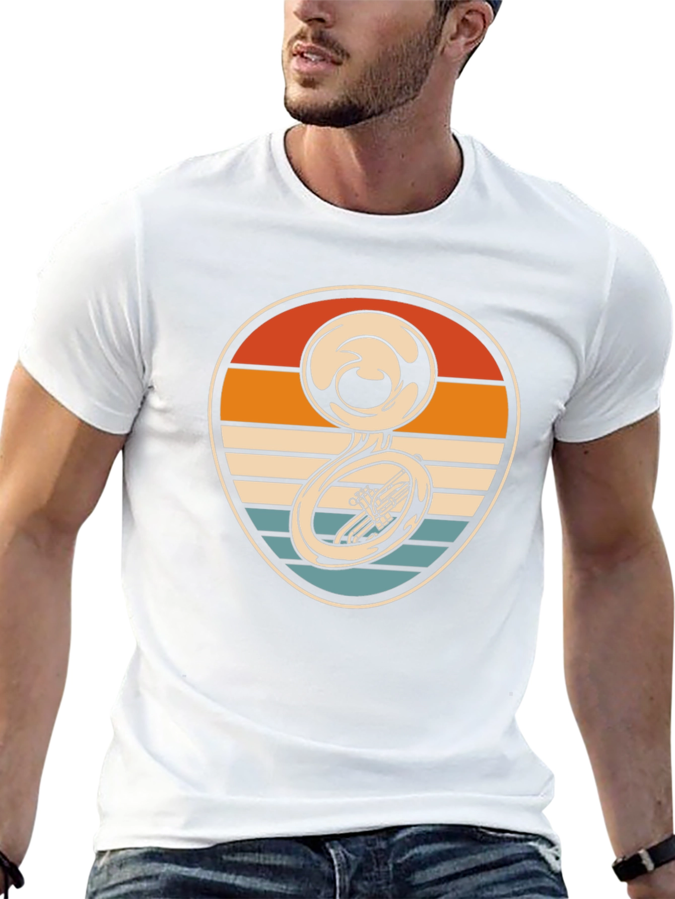Show off your love for music with this unique T-shirt. This black tee features a retro-style graphic of a tuba set against a vibrant sunset background. The design incorporates warm shades of orange and yellow, contrasted with cool blues and off-white, creating an eye-catching vintage aesthetic. Perfect for musicians, music lovers, or anyone who appreciates a cool graphic tee. Made from comfortable, breathable material, this shirt is ideal for everyday wear. Add some musical flair to your wardrobe today!