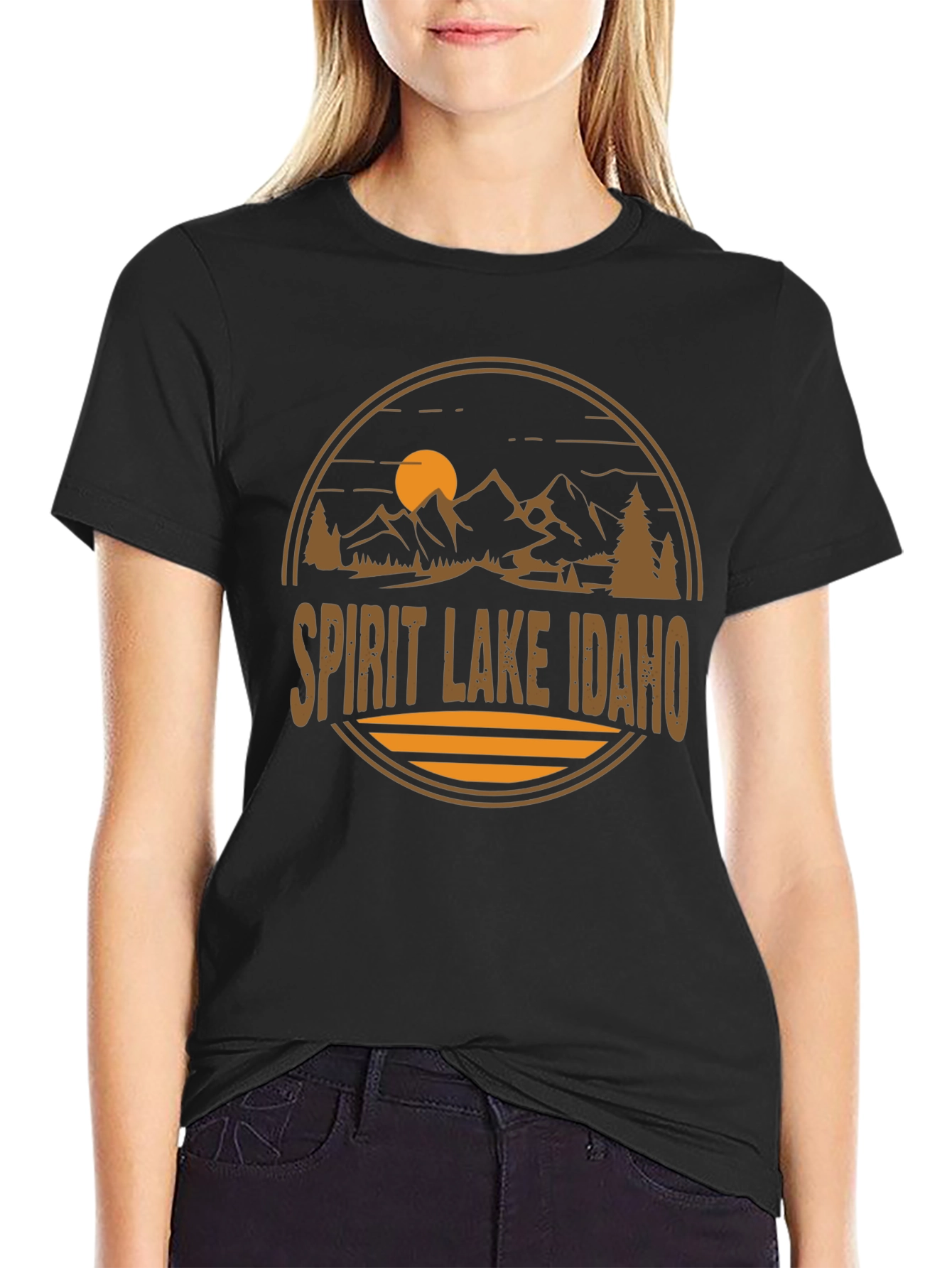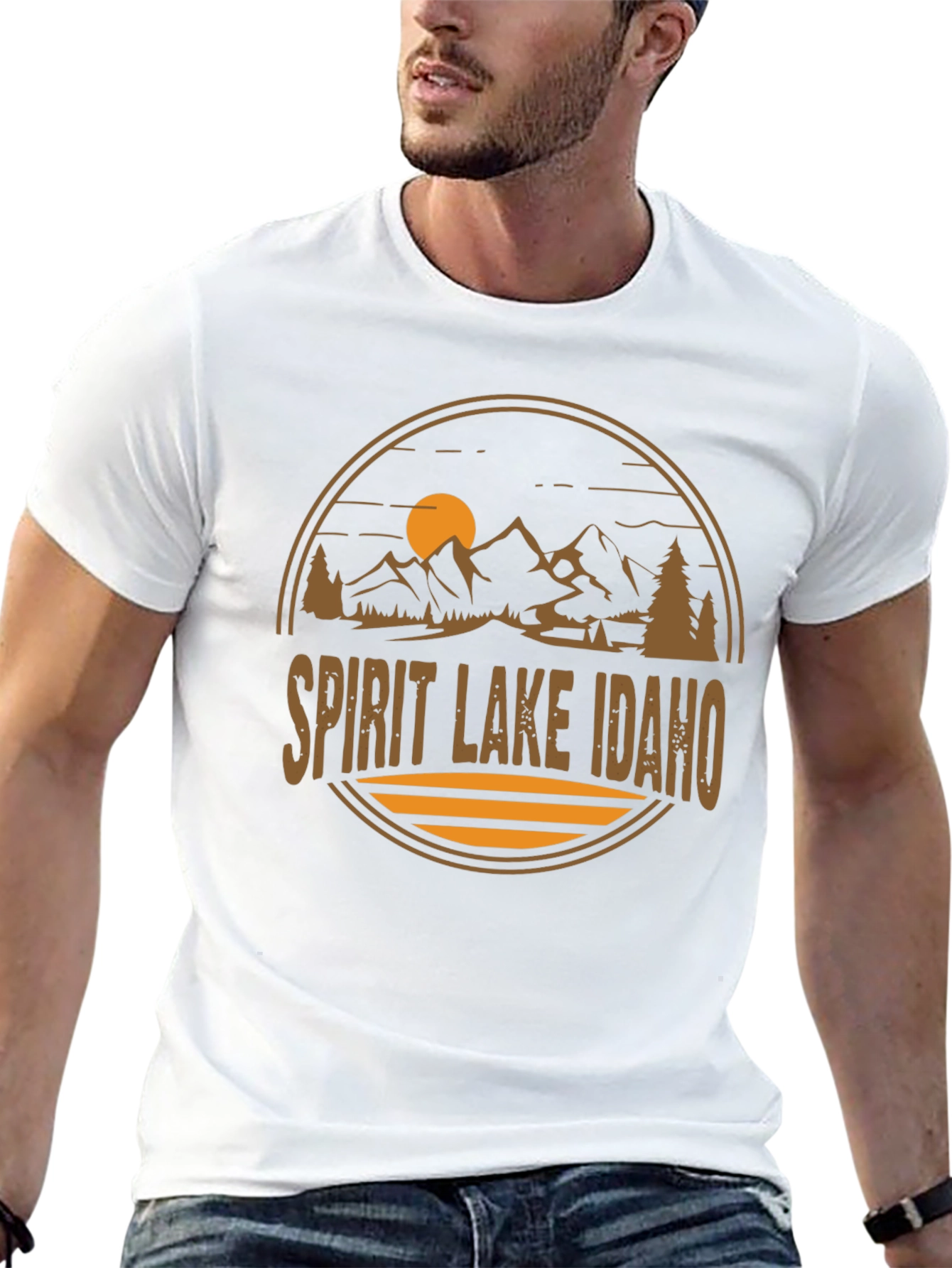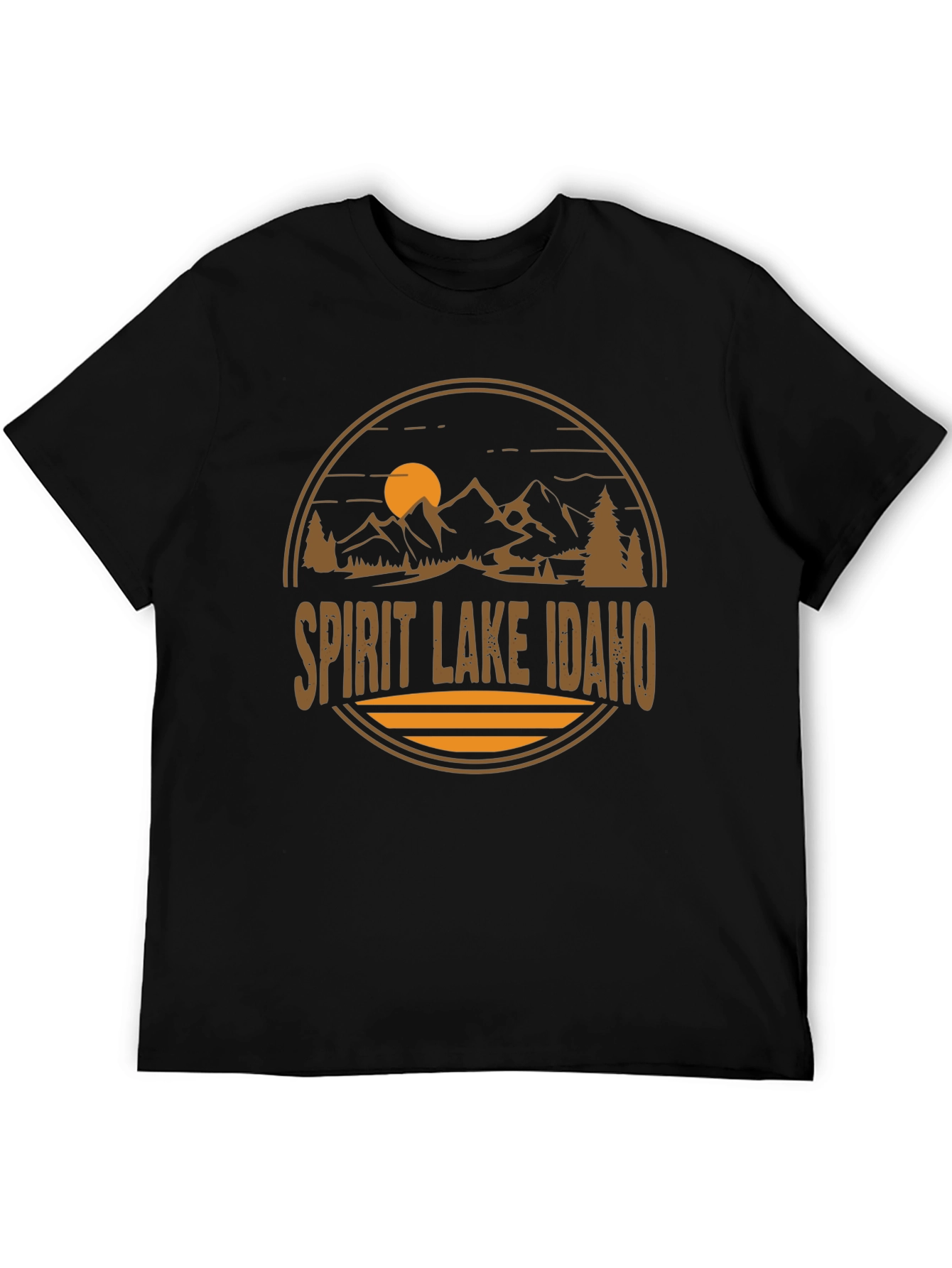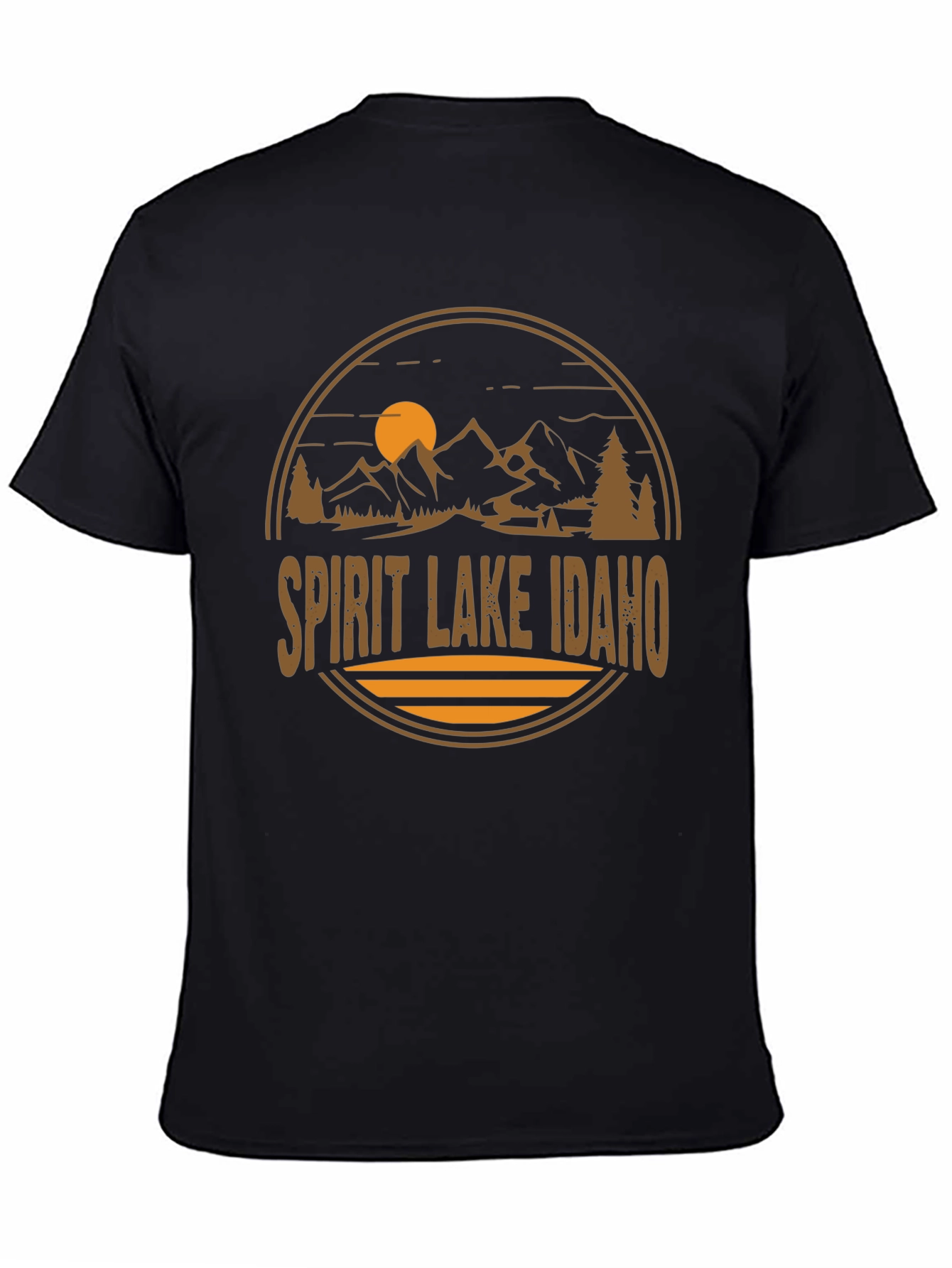 Show your love for Spirit Lake Idaho with this stylish graphic t-shirt. The shirt features a unique circular design with mountains, trees, and a setting sun. The text "SPIRIT LAKE IDAHO" is prominently displayed, making it perfect for locals and tourists alike. Made from comfortable, breathable fabric, this tee is ideal for everyday wear. Whether you're hiking, relaxing by the lake, or simply running errands, this shirt is sure to become a favorite. The dark color and durable print ensure it will look great wash after wash. Get yours today and celebrate the beauty of Spirit Lake!