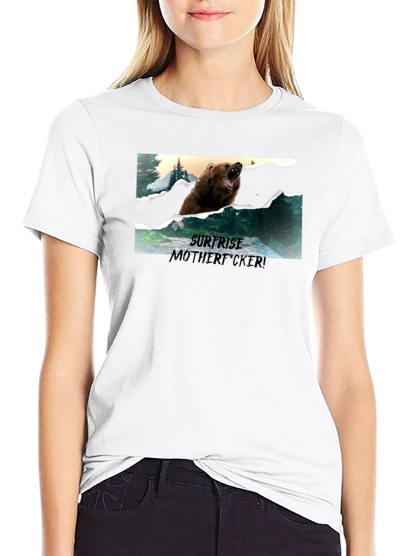 This black t-shirt features a striking graphic design. The design simulates a ripped paper effect revealing a roaring bear in a wilderness scene. Below the graphic, bold text reads, "SURPRISE MOTHERF*CKER!" making it a humorous and edgy choice. Constructed from a comfortable cotton blend, it’s perfect for casual wear, making a statement, or adding a bit of fun to your wardrobe. This tee is ideal for those who appreciate bold, expressive designs. Great for everyday wear and expressing a unique sense of humor.