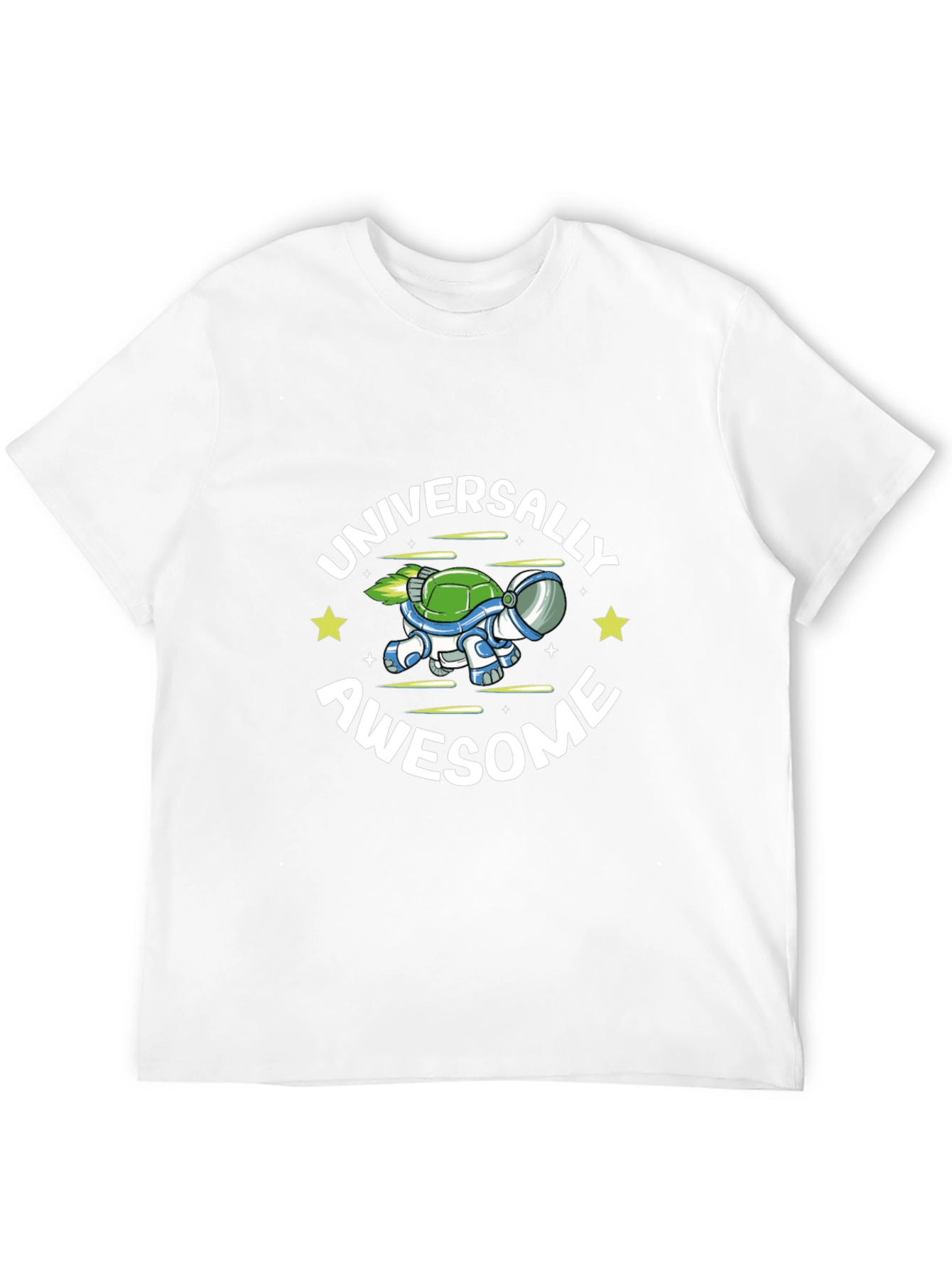 Show off your unique style with this "Universally Awesome" turtle-themed t-shirt! This eye-catching black tee features a whimsical design of a turtle dressed as an astronaut, complete with a helmet and a rocket boost, encircled by the phrase "Universally Awesome." Made from soft and comfortable fabric, this shirt is perfect for everyday wear. Whether you're a space enthusiast, a turtle lover, or simply appreciate quirky designs, this t-shirt is sure to turn heads and spark conversations. Pair it with jeans for a casual look or dress it up with a blazer for a night out. A fun and versatile addition to any wardrobe!